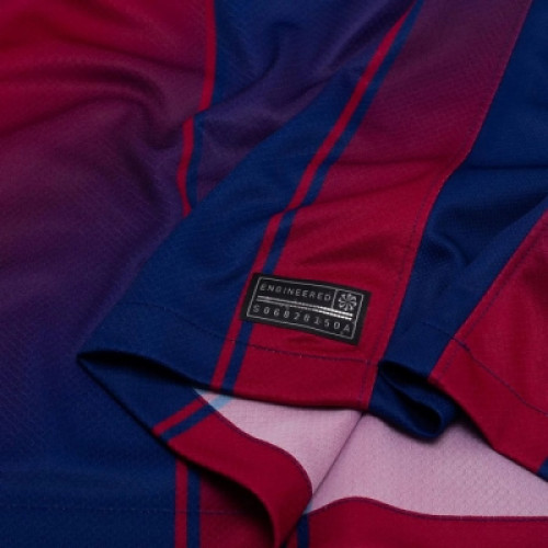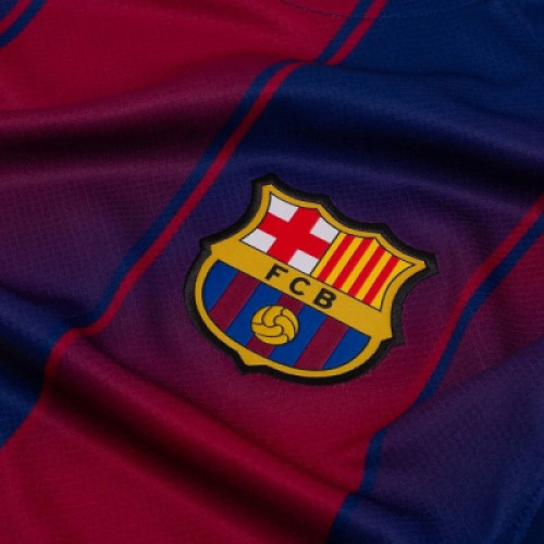 Домашняя футболка ФК «Барселона» с длинным рукавом сезона 2025/2026 выполнена в традиционных гранатовых и темно-синих вертикальных полосах с эффектом градиента. Дизайн включает желтые логотипы спонсоров, флаг Каталонии под воротником и девиз «Больше чем клуб» внутри. Облегченный влагоотводящий материал гарантирует комфорт. Основные характеристики: Дизайн: Классическая сине-гранатовая гамма, часто с уникальным градиентным переходом между полосами в центре. Детали: Желтые элементы (логотипы), герб клуба, флаг Каталонии на воротнике. Материал: Высокотехнологичный полиэстер, обеспечивающий быстрое высыхание и отвод влаги (синтетика нового поколения). Рукав: Длинный, подходит для прохладной погоды
