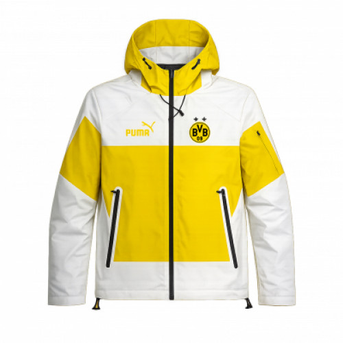 Ветровка Borussia Dortmund сезона 2025/26 - яркая жёлто-белая куртка с капюшоном и контрастными чёрными молниями. Цвет сразу читается как BVB, при этом белые вставки делают образ свежим и аккуратным. Удобна для города и поездок на матчи в прохладную погоду, капюшон защищает от ветра, карманы на молнии держат вещи под рукой.