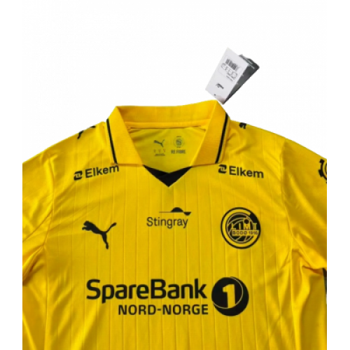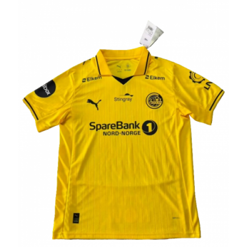 Домашняя футболка ФК «Будё-Глимт» сезона 2025/26 — это яркое воплощение северной энергии и триумфального стиля одного из самых успешных клубов Норвегии последних лет. Цвет: Традиционный ослепительно-желтый, ставший визитной карточкой клуба за Полярным кругом. В сезоне 25/26 на передней части футболки используется уникальный жаккардовый паттерн, вдохновленный суровой северной природой — очертаниями скал или динамикой северного сияния. Детали: Минималистичный дизайн с контрастными черными элементами (логотипы, окантовка воротника и манжет), что подчеркивает современный скандинавский стиль. Логотипы: Лаконичная эмблема клуба расположена на левой стороне груди, логотип — на правой.
