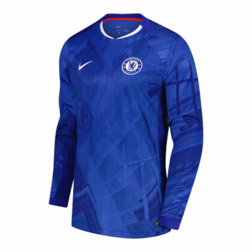 Домашняя джерси Chelsea сезона 2025/26 с длинным рукавом: фирменный насыщенный синий цвет и графичный тон-в-тон узор по всей поверхности. Белый логотип Nike и эмблема клуба на груди подчёркивают классический стиль, а круглый ворот с белой окантовкой и красным акцентом внутри добавляет аккуратную деталь. Отличный вариант для матчей и повседневного спорта.