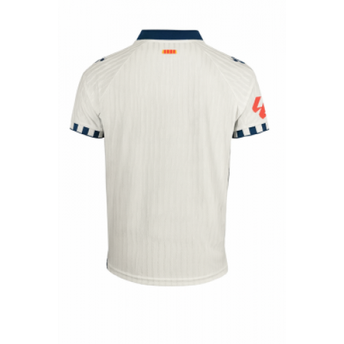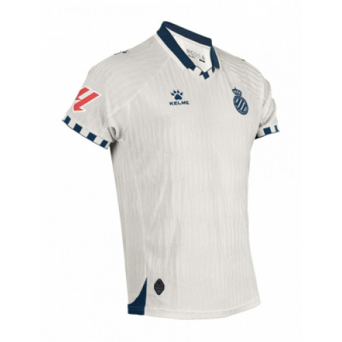 Гостевая форма «Эспаньола» сезона 2025/26 от Kelme выполнена в утончённой светло-серой гамме с глубокими синими акцентами — элегантное и современное прочтение классического стиля клуба. Воротник-поло и манжеты украшены фирменным геометрическим узором, а тонкая вертикальная текстура ткани придаёт образу динамику и глубину. Эмблема клуба и логотип Kelme нанесены в однотонном синем, создавая минималистичный, но выразительный контраст. Футболка изготовлена из лёгкого и дышащего материала с технологией отвода влаги, обеспечивая комфорт при игре и в повседневной носке. Этот дизайн символизирует зрелость и уверенность «Эспаньола» — клуба с богатой историей и современным характером.