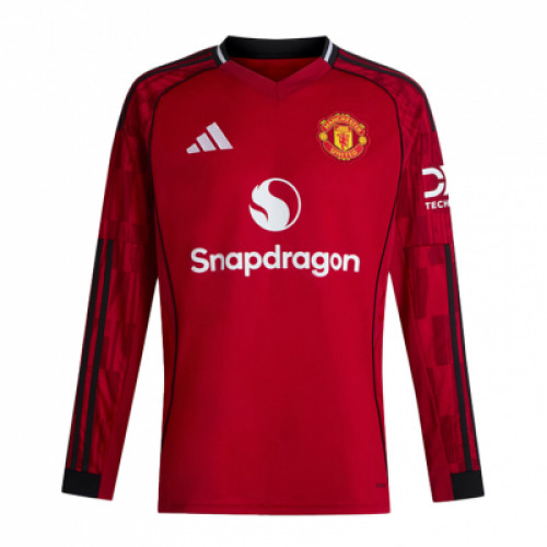 Домашняя джерси Manchester United сезона 2025/26 с длинным рукавом: насыщенно-красный корпус и рукава с геометрическим узором, чёрные полосы и манжеты создают строгий контраст. V-образный ворот добавляет классики, а эмблема клуба и спонсор Snapdragon подчёркивают официальный матчевый стиль. Отличный вариант для болельщиков и на каждый день.