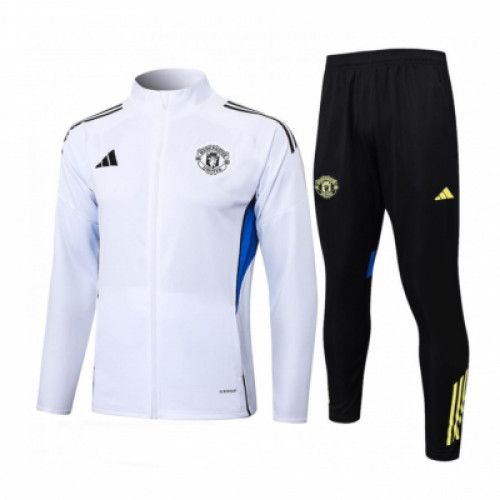 Спортивный костюм Manchester United 2025/26 - белая олимпийка на полной молнии с чёрными акцентами и синими вставками, в паре с чёрными брюками и жёлтыми деталями. Контрастная расцветка выглядит свежо и заметно, при этом остаётся аккуратной и универсальной на каждый день. Отличный вариант для города, поездок и активной носки в прохладную погоду, образ получается цельный и сразу узнаваемый.