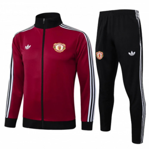 Классический спортивный костюм Manchester United в стиле Originals. Бордовая олимпийка на молнии с белыми полосками на рукавах и эмблемой клуба подчеркивает принадлежность к любимой команде. Черные зауженные штаны с логотипом на бедре и эластичным поясом обеспечивают комфорт и свободу движений во время тренировок и повседневной активности.