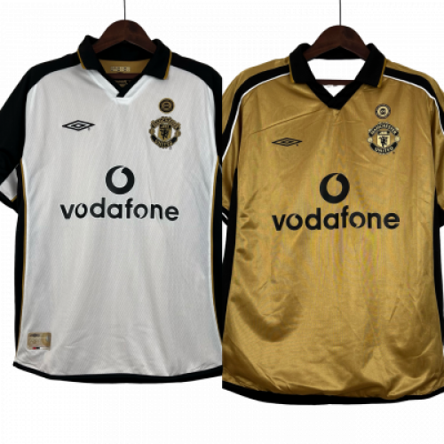Ретро футболка английского ФК Манчестер Юнайтед, для гостевых игр сезона 2000-2001. Футболка выполнена с одной стороный в золотом цвете с чёрными элементами, а с другой стороны в белом цвете с чёрными вставками, украшена эмблемой клуба.