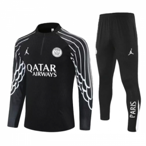 Детский тренировочный костюм ПСЖ сезона 2025/26 в черном цвете. Костюм предназначен для тренировок в прохладную погоду и активного отдыха, сочетая уличный стиль Парижа с профессиональными спортивными характеристиками. Логотипы выполнены с эффектом серебристой фольги или металлическим блеском. Материал эффективно отводит влагу, обеспечивая сухость и комфорт во время интенсивных нагрузок. Комплектация: Дрилл-топ (кофта): Имеет приталенный крой, воротник-стойку и молнию до середины груди. Рукава часто оснащены скрытыми отверстиями для больших пальцев. Брюки : Зауженные книзу с эластичным поясом и боковыми карманами на молнии.