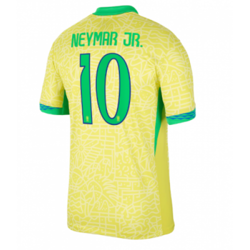 Основные характеристики Цвет: Классический ярко-желтый с едва заметным тисненым узором по всей поверхности, изображающим элементы бразильской флоры и фауны (включая макао и национальные парки). Принт: На спине нанесен официальный шрифт сезона — имя NEYMAR JR и номер 10. На груди расположен малый номер 10. Материал: 100% переработанный полиэстер с технологией Dri-FIT. Ткань эффективно отводит влагу, обеспечивая сухость и прохладу даже в жаркую погоду. Детали дизайна Воротник: V-образный вырез с контрастной зеленой окантовкой. Внутри воротника часто располагается скрытая деталь с надписью «Brasil». Эмблема: Тканый герб CBF (Конфедерации футбола Бразилии) с пятью чемпионскими звездами, расположенный по центру груди (в стиле ретро-форм 90-х).