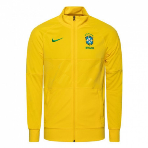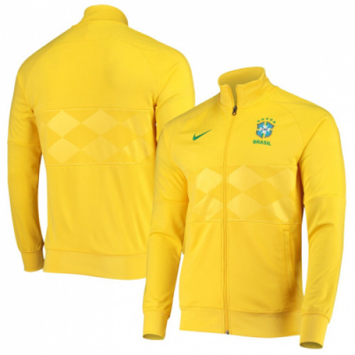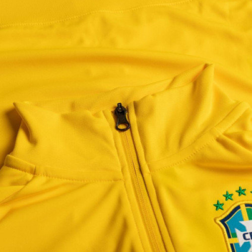 Жёлтая олимпийка сборной Бразилии Nike: полный замок, высокий воротник-стойка, гладкий трикотаж с тиснёным ромбовидным узором на груди и спине. Зелёный свуш и эмблема CBF со звёздами, боковые карманы, манжеты и низ на резинке.